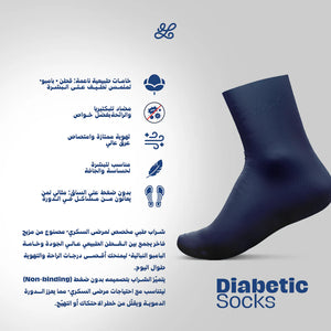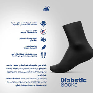 - جوارب طبيه لمرضى السكر مصممة خصيصاً لتكون ناعمة وخالية من الدرزات القاسية، مما يقلل من فرصة حدوث التهيجات الناتجة عن مضاعفات مرض السكر.